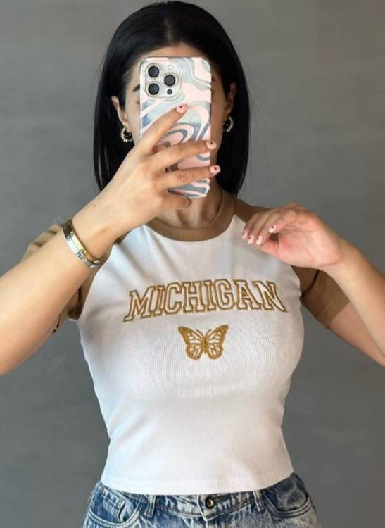 کراپ گلدوزی Michigan آستین تیشرتی یقه گرد سوپرپنبه کبریتی